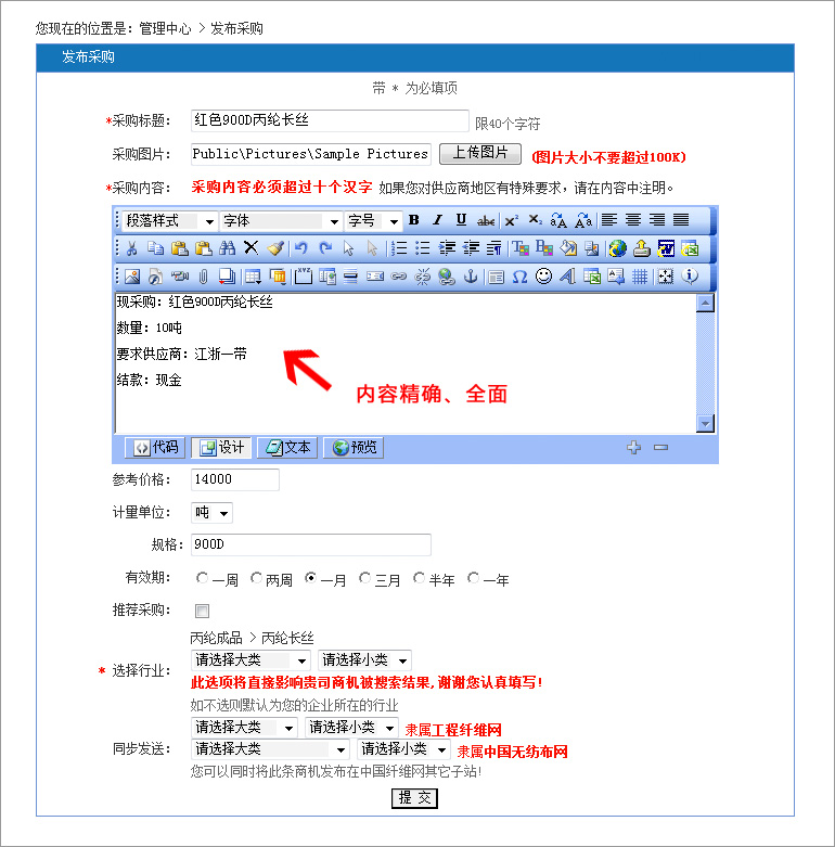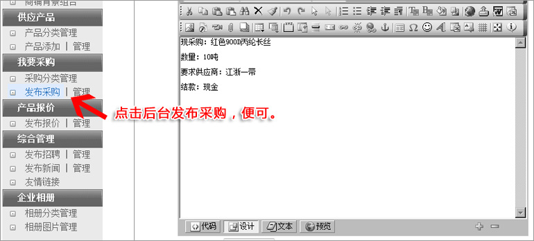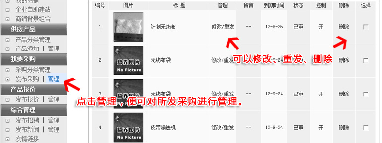 點擊"我要采購"下面的"管理",便可以對以往采購進行修改、重發、刪除。 3:新發布的采購信息何時上網?