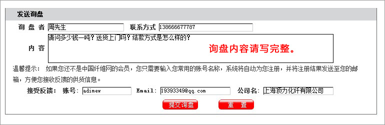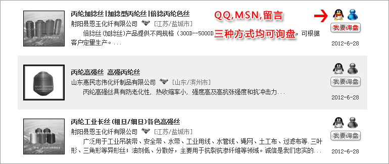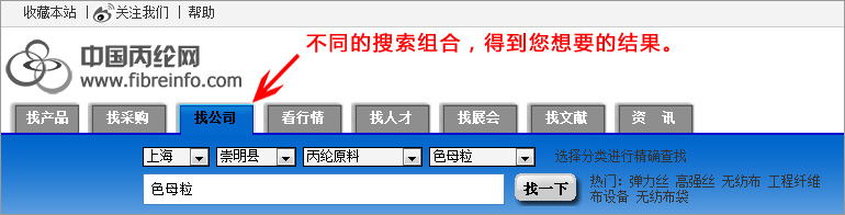 4:如何利用搜索尋找對應供應商? 產品搜索,可以選擇地區+產品分類,結果更加精確。 公司搜索,可以選擇地區+產品分類,搜到您想要的結果。 5:如何對產品進行詢價? 在產品頁面,你可以通過QQ、MSN、在線留言等方式與供應商取得聯系,或直接在單個產品頁,給供應商發送詢盤。